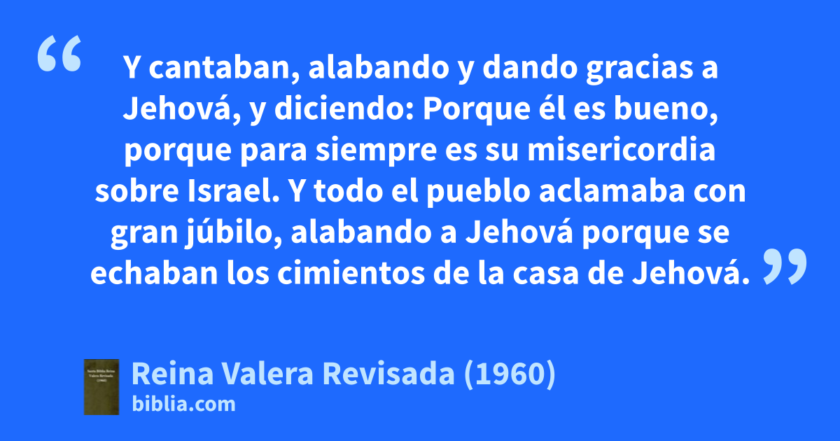 10Y cuando los albañiles del templo de Jehová echaban los cimientos, pusieron a los sacerdotes vestidos de sus ropas y con trompetas, y a los levitas hijos de Asaf con címbalos, para que alabasen a Jehová, según la ordenanza de David rey de Israel.e 11Y cantaban, alabando y dando gracias a Jehová, y diciendo: Porque él es bueno, porque para siempre es su misericordia sobre Israel.f Y todo el pueblo aclamaba con gran júbilo, alabando a Jehová porque se echaban los cimientos de la casa de Jehová. 12Y muchos de los sacerdotes, de los levitas y de los jefes de casas paternas, ancianos que habían visto la casa primera, viendo echar los cimientos de esta casa, lloraban en alta voz, mientras muchos otros daban grandes gritos de alegría. 13Y no podía distinguir el pueblo el clamor de los gritos de alegría, de la voz del lloro; porque clamaba el pueblo con gran júbilo, y se oía el ruido hasta de lejos.