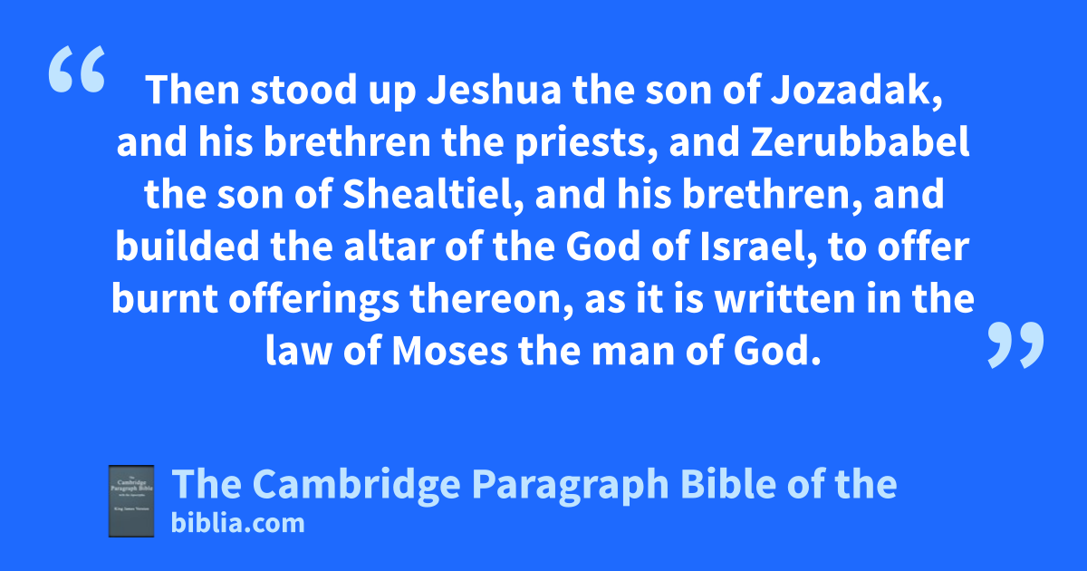 III. aAnd when the seventh month was come, and the children of Israel were in the cities, the people gathered themselves together as one man to Jerusalem. 2 Then stood up * Jeshua the son of Jozadak, and his brethren the priests, and * Zerubbabel the son of * Shealtiel, and his brethren, and builded the altar of the God of Israel, to offer burnt offerings thereon, as it is bwritten in the law of Moses cthe man of God. 3 And they set the altar upon his bases; for fear was upon them because of the people of those countries: and they offered burnt offerings thereon unto the Lord, even dburnt offerings morning and evening. 4 They kept also the efeast of tabernacles, fas it is written, and offered gthe daily burnt offerings by number, according to the custom, * as the duty of every day required; 5 and afterward offered the hcontinual burnt offering, both iof the new moons, and of all the kset feasts of the Lord that were consecrated, and of every one that willingly offered a freewill offering unto the Lord. 6 From the first day of the lseventh month began they to offer burnt offerings unto the Lord. But * the foundation of the temple of the Lord was not yet laid. 7 They gave money also unto the masons, and to the * carpenters; and mmeat, and drink, and oil, unto them of Zidon, and to them of Tyre, to bring cedar trees from Lebanon to the sea of nJoppa, oaccording to the grant that they had of Cyrus king of Persia.