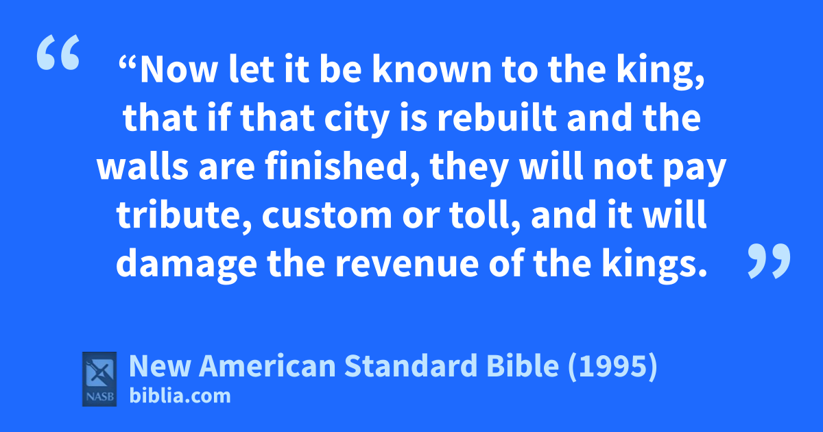 13 “Now let it be known to the king, that if that city is rebuilt and the walls are finished, athey will not pay tribute, custom or toll, and it will damage the revenue of the kings.