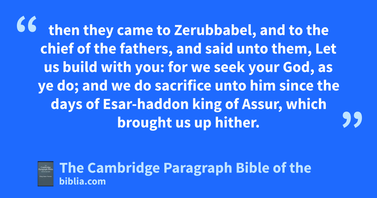 IV. Now when athe adversaries of Judah and Benjamin heard that * the children of the captivity builded the temple unto the Lord God of Israel; 2 then they came to Zerubbabel, and to the chief of the fathers, and said unto them, Let us build with you: for we seek your God, as ye do; and we do sacrifice unto him bsince the days of Esar-haddon king of Assur, which brought us up hither. 3 * But Zerubbabel, and Jeshua, and the rest of the chief of the fathers of Israel, said unto them, cYou have nothing to do with us dto build a house unto our God; but we ourselves together will build unto the Lord God of Israel, as eking Cyrus the king of Persia hath commanded us. 4 * Then fthe people of the land gweakened the hands of the people of Judah, and troubled them in building, 5 and hired counsellers against them, to hfrustrate their purpose, all the days of Cyrus king of Persia, even until the reign of Darius king of Persia. 6 * And in the reign of * Ahasuerus, in the beginning of his reign, wrote they unto him an iaccusation against the inhabitants of Judah and Jerusalem. 7 And in the days of Artaxerxes wrote * Bishlam, jMithredath, Tabeel, and the rest of their * companions, unto Artaxerxes king of Persia; and the writing of kthe letter was written lin the Syrian tongue, and interpreted in the Syrian tongue.
