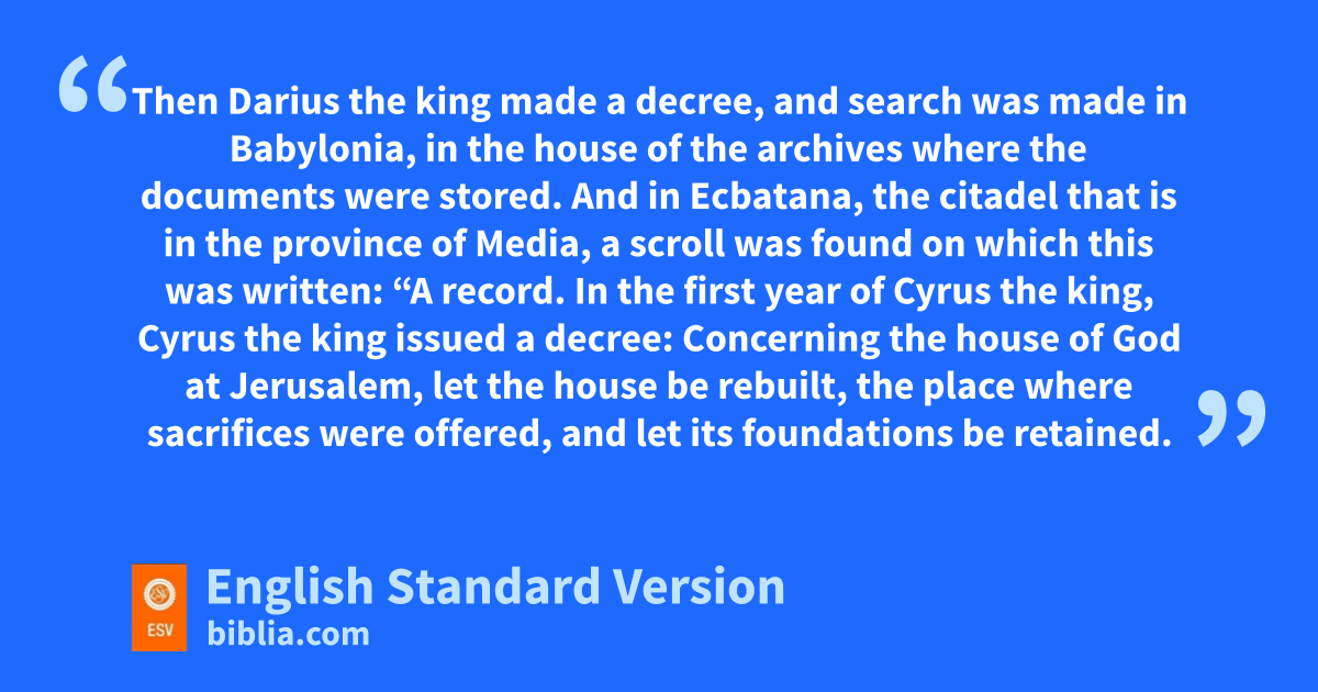 6 Then Darius the king made a decree, and tsearch was made in Babylonia, in the house of the archives where the documents were stored. 2 And in Ecbatana, the citadel that is uin the province of Media, a scroll was found on which this was written: “A record. 3 In the first year of Cyrus the king, Cyrus the king issued a decree: Concerning the house of God at Jerusalem, let the house be rebuilt, the place where sacrifices were offered, and let its foundations be retained. Its height shall be sixty cubits1 and its breadth sixty cubits, 4 vwith three layers of great stones and one layer of timber. Let the cost be paid from the royal treasury. 5 And also wlet the gold and silver vessels of the house of God, which Nebuchadnezzar took out of the temple that is in Jerusalem and brought to Babylon, be restored and brought back to the temple that is in Jerusalem, each to its place. You shall put them in the house of God.”