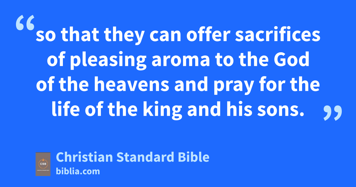 The cost is to be paid in full to these men out of the royal revenuesv from the taxes of the region west of the Euphrates River, so that the work will not stop. 9 Whatever is needed—young bulls, rams, and lambs for burnt offerings to the God of the heavens, or wheat, salt, wine, and oil, as requested by the priests in Jerusalem—let it be given to them every day without fail,a 10 so that they can offer sacrifices of pleasing aroma to the God of the heavens and pray for the life of the king and his sons.b