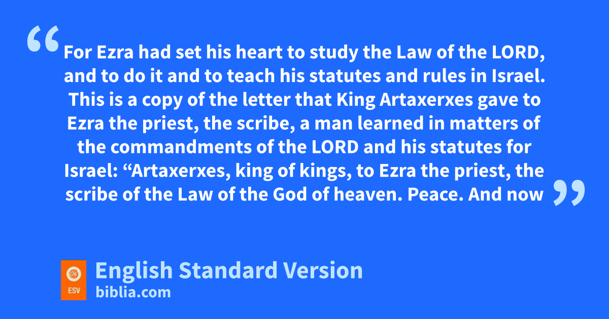 11 This is a copy of the letter that King Artaxerxes gave to Ezra the priest, the scribe, a man learned in matters of the commandments of the Lord and his statutes for Israel: 12 “Artaxerxes, fking of kings, to Ezra the priest, the gscribe of the Law of the God of heaven. Peace.2 hAnd now 13 iI make a decree that anyone of the people of Israel or their priests or Levites in my kingdom, who freely offers to go to Jerusalem, may go with you. 14 For you are sent by the king jand his seven counselors to make inquiries about Judah and Jerusalem according to the Law of your God, which is in your hand, 15 and also to carry the silver and gold that the king jand his counselors have freely offered to the God of Israel, kwhose dwelling is in Jerusalem, 16 lwith all the silver and gold that you shall find in the whole province of Babylonia, and mwith the freewill offerings of the people and the priests, vowed willingly for the house of their God that is in Jerusalem. 17 With this money, then, you shall with all diligence buy bulls, rams, and lambs, with their grain offerings and their drink offerings, and nyou shall offer them on the altar of the house of your God that is in Jerusalem. 18 Whatever seems good to you and your brothers to do with the rest of the silver and gold, you may do, according to the will of your God. 19 The vessels that have been given you for the service of the house of your God, you shall deliver before the God of Jerusalem. 20 And whatever else is required for the house of your God, which it falls to you to provide, you may provide it out of the king’s treasury.