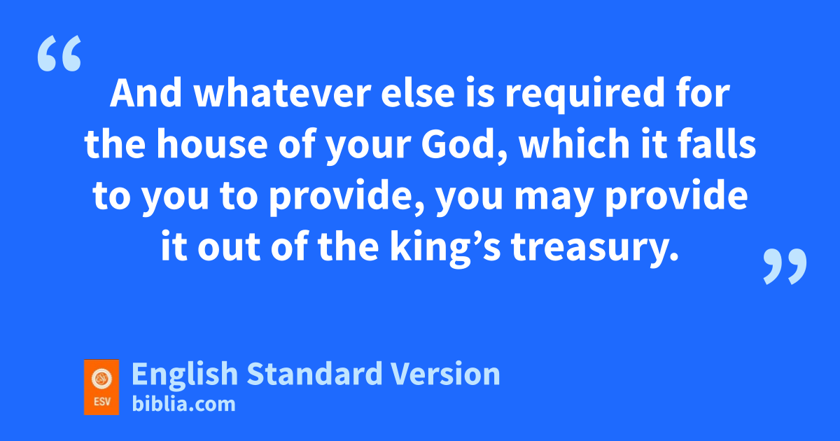 21 “And I, Artaxerxes the king, make a decree to all the treasurers in the province Beyond the River: Whatever Ezra the priest, the scribe of the Law of the God of heaven, requires of you, let it be done with all diligence, 22 up to 100 talents3 of silver, 100 cors4 of wheat, 100 baths5 of wine, 100 baths of oil, and salt without prescribing how much. 23 Whatever is decreed by the God of heaven, let it be done in full for the house of the God of heaven, lest his wrath be against the realm of the king and his sons. 24 We also notify you that it shall not be lawful to impose otribute, custom, or toll on anyone of the priests, the Levites, the singers, the doorkeepers, the temple servants, or other servants of this house of God.