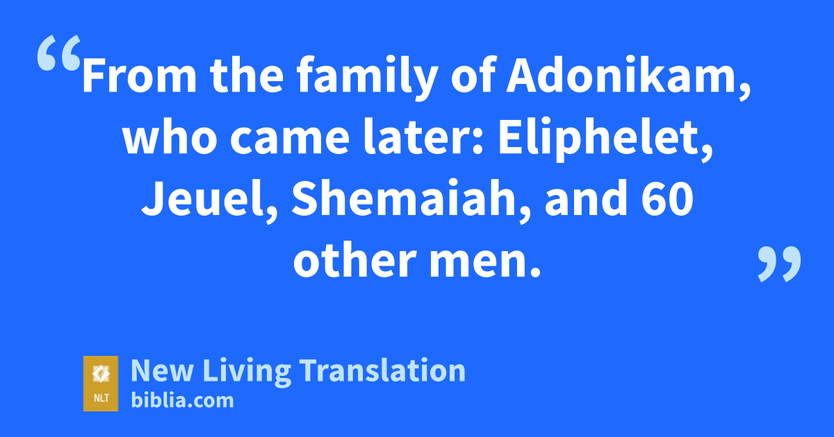 13 From the family of Adonikam, who came later* : Eliphelet, Jeuel, Shemaiah, and 60 other men.