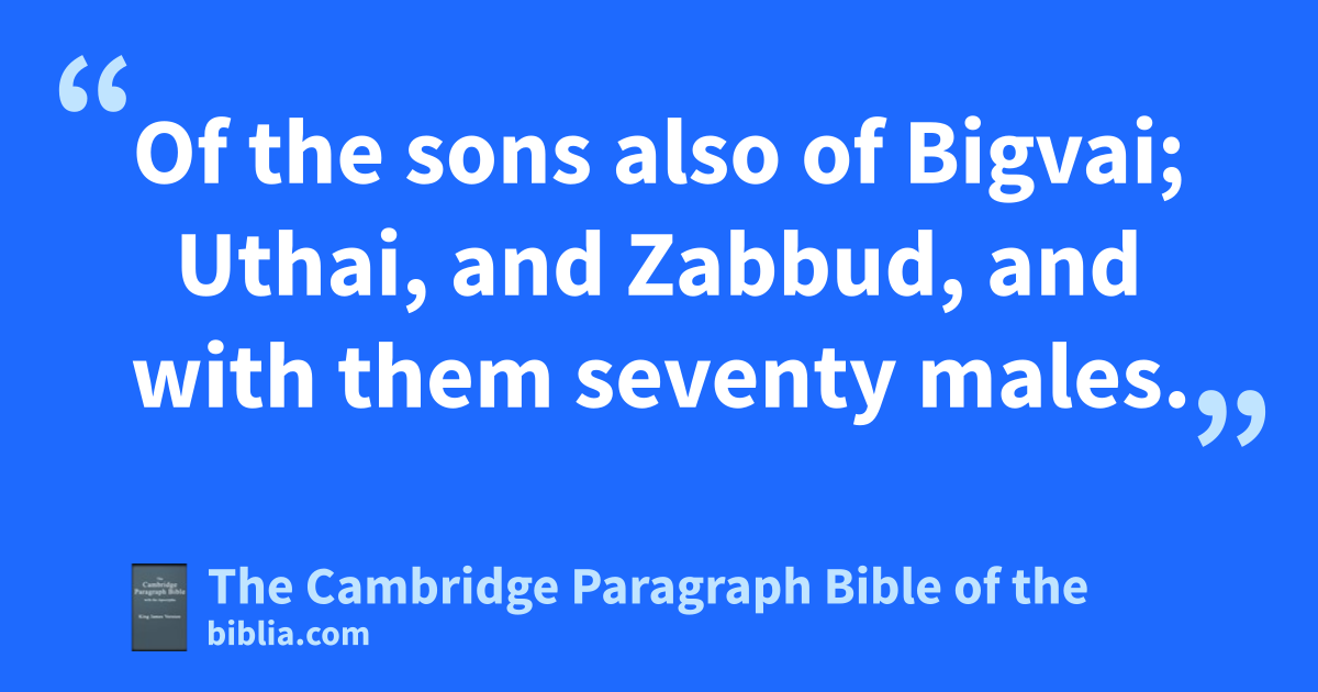 VIII. * These are now the chief of their fathers, and this is the genealogy of them that went up with me from Babylon, in the reign of Artaxerxes the king. 2 Of the sons of aPhinehas; Gershom: of the sons of aIthamar; bDaniel: of the sons of David; cHattush. 3 Of the sons of dShechaniah, of the sons of ePharosh; Zechariah: and with him were reckoned by genealogy of the males an hundred and fifty. 4 Of the sons of fPahath-moab; Elihoenai the son of Zerahiah, and with him two hundred males. 5 Of the sons of dShechaniah; the son of Jahaziel, and with him three hundred males. 6 Of the sons also of ffAdin; Ebed the son of Jonathan, and with him fifty males. 7 And of the sons of gElam; Jeshaiah the son of Athaliah, and with him seventy males. 8 And of the sons of hShephatiah; Zebadiah the son of Michael, and with him fourscore males. 9 Of the sons of iJoab; Obadiah the son of Jehiel, and with him two hundred and eighteen males. 10 And of the sons of Shelomith; the son of Josiphiah, and with him an hundred and threescore males. 11 And of the sons of kBebai; Zechariah the son of Bebai, and with him twenty and eight males. 12 And of the sons of kAzgad; Johanan * the son of Hakkatan, and with him an hundred and ten males. 13 And of the last sons of lAdonikam, whose names are these, Eliphelet, Jeiel, and Shemaiah, and with them threescore males. 14 Of the sons also of mBigvai; Uthai, and * Zabbud, and with them seventy males.