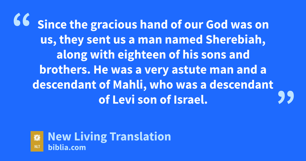 18 Since the gracious hand of our God was on us, they sent us a man named Sherebiah, along with eighteen of his sons and brothers. He was a very astute man and a descendant of Mahli, who was a descendant of Levi son of Israel.* 19 They also sent Hashabiah, together with Jeshaiah from the descendants of Merari, and twenty of his sons and brothers, 20 and 220 Temple servants. The Temple servants were assistants to the Levites—a group of Temple workers first instituted by King David and his officials. They were all listed by name.