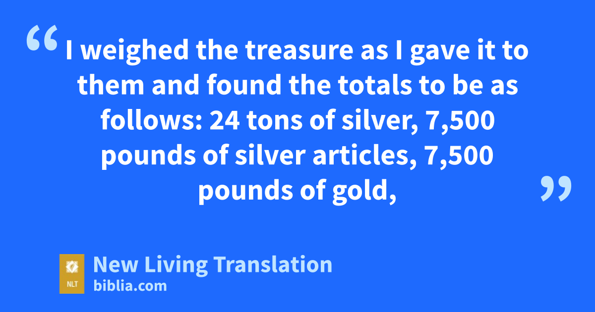 24 I appointed twelve leaders of the priests—Sherebiah, Hashabiah, and ten other priests—25 to be in charge of transporting the silver, the gold, the gold bowls, and the other items that the king, his council, his officials, and all the people of Israel had presented for the Temple of God. 26 I weighed the treasure as I gave it to them and found the totals to be as follows: