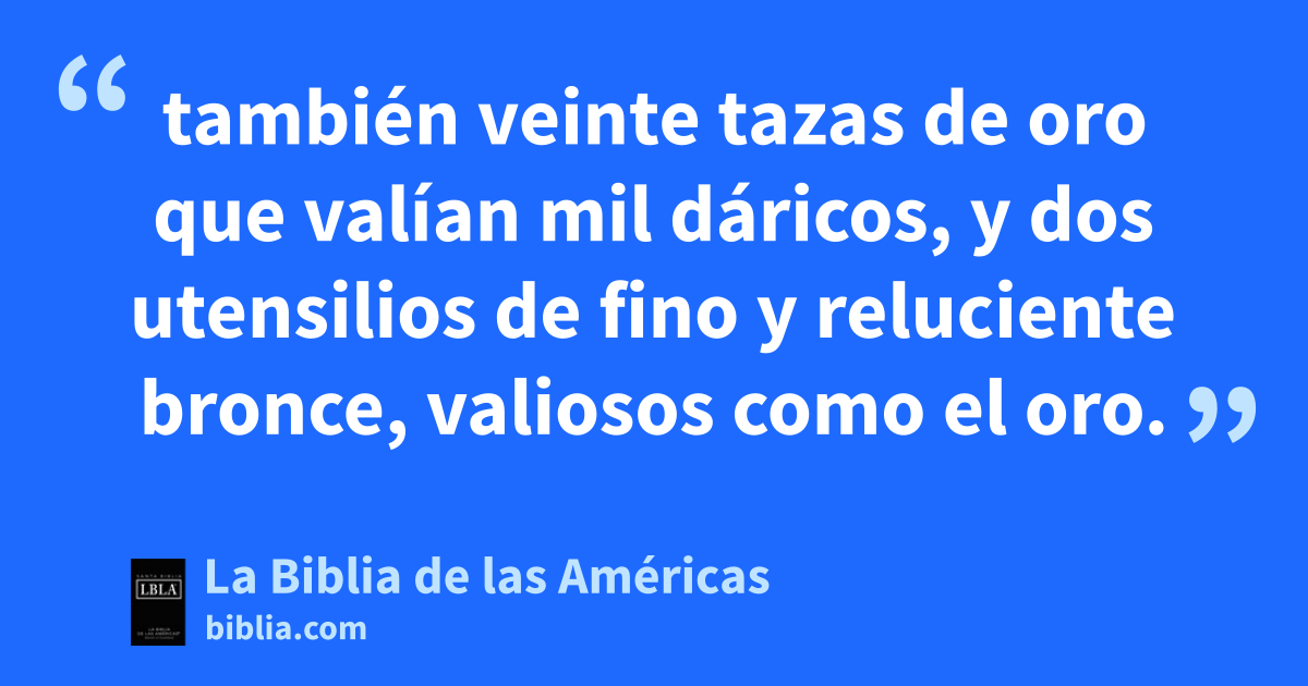 27 también veinte tazas de oro que valían mil dáricos1, y dos utensilios de fino y reluciente bronce, valiosos como el oro.