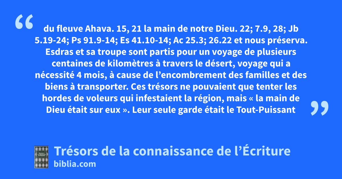 du fleuve Ahava. 15, 21 la main de notre Dieu. 22; 7.9, 28; Jb 5.19-24; Ps 91.9-14; Es 41.10-14; Ac 25.3; 26.22 et nous préserva. Esdras et sa troupe sont partis pour un voyage de plusieurs centaines de kilomètres à travers le désert, voyage qui a nécessité 4 mois, à cause de l’encombrement des familles et des biens à transporter. Ces trésors ne pouvaient que tenter les hordes de voleurs qui infestaient la région, mais « la main de Dieu était sur eux ». Leur seule garde était le Tout-Puissant et ils auraient eu honte de ne pas lui faire confiance.