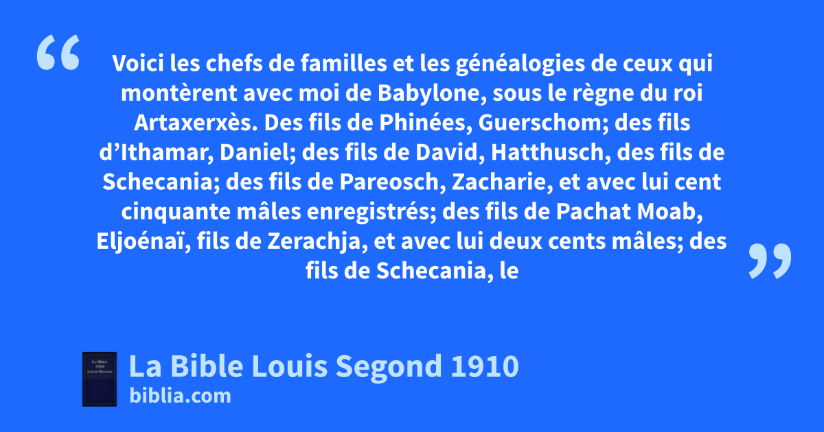 1Voici les chefs de familles et les généalogies de ceux qui montèrent avec moi de Babylone, sous le règne du roi Artaxerxès. 2Des fils de Phinées, Guerschom; des fils d’Ithamar, Daniel; des fils de David, Hatthusch, des fils de Schecania; 3des fils de Pareosch, Zacharie, et avec lui cent cinquante mâles enregistrés; 4des fils de Pachat Moab, Eljoénaï, fils de Zerachja, et avec lui deux cents mâles; 5des fils de Schecania, le fils de Jachaziel, et avec lui trois cents mâles; 6des fils d’Adin, Ébed, fils de Jonathan, et avec lui cinquante mâles; 7des fils d’Élam, Ésaïe, fils d’Athalia, et avec lui soixante-dix mâles; 8des fils de Schephathia, Zebadia, fils de Micaël, et avec lui quatre-vingts mâles; 9des fils de Joab, Abdias, fils de Jehiel, et avec lui deux cent dix-huit mâles; 10des fils de Schelomith, le fils de Josiphia, et avec lui cent soixante mâles; 11des fils de Bébaï, Zacharie, fils de Bébaï, et avec lui vingt-huit mâles; 12des fils d’Azgad, Jochanan, fils d’Hakkathan, et avec lui cent dix mâles; 13des fils d’Adonikam, les derniers, dont voici les noms: Éliphéleth, Jeïel et Schemaeja, et avec eux soixante mâles; 14des fils de Bigvaï, Uthaï et Zabbud, et avec eux soixante-dix mâles. 15Je les rassemblai près du fleuve qui coule vers Ahava, et nous campâmes là trois jours. Je dirigeai mon attention sur le peuple et sur les sacrificateurs, et je ne trouvai là aucun des fils de Lévi. 16Alors je fis appeler les chefs Éliézer, Ariel, Schemaeja, Elnathan, Jarib, Elnathan, Nathan, Zacharie et Meschullam, et les docteurs Jojarib et Elnathan. 17Je les envoyai vers le chef Iddo, demeurant à Casiphia, et je mis dans leur bouche ce qu’ils devaient dire à Iddo et à ses frères les Néthiniens qui étaient à Casiphia, afin qu’ils nous amenassent des serviteurs pour la maison de notre Dieu. 18Et, comme la bonne main de notre Dieu était sur nous, ils nous amenèrent Schérébia, homme de sens, d’entre les fils de Machli, fils de Lévi, fils d’Israël, et avec lui ses fils et ses frères, au nombre de dix-huit; 19Haschabia, et avec lui Ésaïe, d’entre les fils de Merari, ses frères et leurs fils, au nombre de vingt; 20et d’entre les Néthiniens, que David et les chefs avaient mis au service des Lévites, deux cent vingt Néthiniens, tous désignés par leurs noms. 21Là, près du fleuve d’Ahava, je publiai un jeûne d’humiliation devant notre Dieu, afin d’implorer de lui un heureux voyage pour nous, pour nos enfants, et pour tout ce qui nous appartenait. 22J’aurais eu honte de demander au roi une escorte et des cavaliers pour nous protéger contre l’ennemi pendant la route, car nous avions dit au roi: La main de notre Dieu est pour leur bien sur tous ceux qui le cherchent, mais sa force et sa colère sont sur tous ceux qui l’abandonnent. 23C’est à cause de cela que nous jeûnâmes et que nous invoquâmes notre Dieu. Et il nous exauça. 24Je choisis douze chefs des sacrificateurs, Schérébia, Haschabia, et dix de leurs frères. 25Je pesai devant eux al’argent, l’or, et les ustensiles, donnés en offrande pour la maison de notre Dieu par le roi, ses conseillers et ses chefs, et par tous ceux d’Israël qu’on avait trouvés. 26Je remis entre leurs mains six cent cinquante talents d’argent, des ustensiles d’argent pour cent talents, cent talents d’or, 27vingt coupes d’or valant mille dariques, et deux vases d’un bel airain poli, aussi précieux que l’or. 28Puis je leur dis: Vous êtes consacrés à l’Éternel; ces ustensiles sont des choses saintes, et cet argent et cet or sont une offrande volontaire à l’Éternel, le Dieu de vos pères. 29Soyez vigilants, et prenez cela sous votre garde, jusqu’à ce que vous le pesiez devant les chefs des sacrificateurs et les Lévites, et devant les chefs de familles d’Israël, à Jérusalem, dans les chambres de la maison de l’Éternel. 30Et les sacrificateurs et les Lévites reçurent au poids l’argent, l’or et les ustensiles, pour les porter à Jérusalem, dans la maison de notre Dieu. 31Nous partîmes du fleuve d’Ahava pour nous rendre à Jérusalem, le douzième jour du premier mois. La main de notre Dieu fut sur nous et nous préserva des attaques de l’ennemi et de toute embûche pendant la route. 32Nous arrivâmes à Jérusalem, et nous nous y reposâmes trois jours. 33Le quatrième jour, nous pesâmes dans la maison de notre Dieu l’argent, l’or, et les ustensiles, que nous remîmes à Merémoth, fils d’Urie, le sacrificateur; il y avait avec lui Éléazar, fils de Phinées, et avec eux les Lévites Jozabad, fils de Josué, et Noadia, fils de Binnuï. 34Le tout ayant été vérifié, soit pour le nombre, soit pour le poids, on mit alors par écrit le poids du tout. 35Les fils de la captivité revenus de l’exil offrirent en holocauste au Dieu d’Israël douze taureaux pour tout Israël, quatre-vingt-seize béliers, soixante-dix-sept agneaux, et douze boucs comme victimes expiatoires, le tout en holocauste à l’Éternel. 36Ils transmirent les ordres du roi aux satrapes du roi et aux gouverneurs de ce côté du fleuve, lesquels honorèrent le peuple et la maison de Dieu.