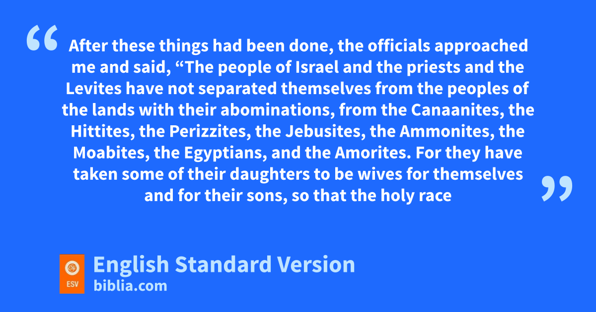 9 After these things had been done, the officials approached me and said, “The people of Israel and the priests and the eLevites have not separated themselves from the peoples of the lands fwith their abominations, from the gCanaanites, the Hittites, the Perizzites, the Jebusites, the Ammonites, the Moabites, the Egyptians, and the Amorites. 2 hFor they have taken some of their daughters to be wives for themselves and for their sons, so that the iholy race1 has jmixed itself with the peoples of the lands. And in this faithlessness the hand of the officials and chief men has been foremost.” 3 As soon as I heard this, I ktore my garment and my cloak and pulled hair from my head and beard and lsat appalled. 4 Then all who mtrembled at the words of the God of Israel, because of the faithlessness of the returned exiles, gathered around me while I sat nappalled until the evening sacrifice. 5 And at the nevening sacrifice I rose from my fasting, with my garment kand my cloak torn, and fell upon my knees oand spread out my hands to the Lord my God, 6 saying: