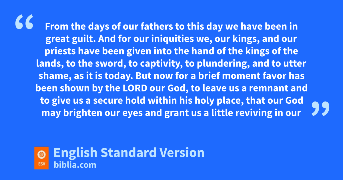 “O my God, I am ashamed and blush to lift my face to you, my God, for our iniquities phave risen higher than our heads, and our qguilt has rmounted up to the heavens. 7 sFrom the days of our fathers to this day we have been in great qguilt. And for our iniquities we, our kings, and our priests have been given into the hand of the kings of the lands, to the sword, to captivity, to plundering, tand to utter shame, as it is today. 8 But now for a brief moment favor has been shown by the Lord our God, to leave us a uremnant and to give us a vsecure hold2 within his holy place, that our God may wbrighten our eyes and grant us a little reviving in our slavery. 9 xFor we are slaves. Yet our God has not forsaken us in our slavery, ybut has extended to us his steadfast love before the kings of Persia, to grant us some reviving to set up the house of our God, to repair its ruins, and to give us protection3 in Judea and Jerusalem.