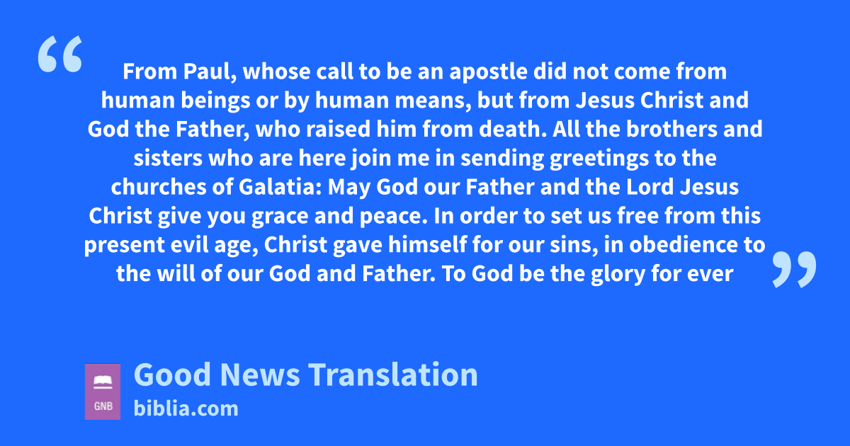 1 From Paul, whose call to be an apostle did not come from human beings or by human means, but from Jesus Christ and God the Father, who raised him from death. 2All the brothers and sisters who are here join me in sending greetings to the churches of Galatia: