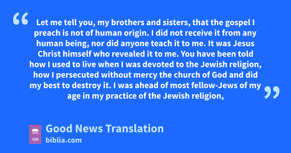 11 Let me tell you, my brothers and sisters, that the gospel I preach is not of human origin. 12I did not receive it from any human being, nor did anyone teach it to me. It was Jesus Christ himself who revealed it to me.