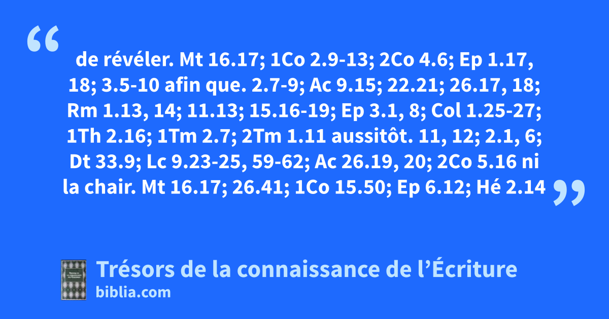 de révéler. Mt 16.17; 1Co 2.9-13; 2Co 4.6; Ep 1.17, 18; 3.5-10 afin que. 2.7-9; Ac 9.15; 22.21; 26.17, 18; Rm 1.13, 14; 11.13; 15.16-19; Ep 3.1, 8; Col 1.25-27; 1Th 2.16; 1Tm 2.7; 2Tm 1.11 aussitôt. 11, 12; 2.1, 6; Dt 33.9; Lc 9.23-25, 59-62; Ac 26.19, 20; 2Co 5.16 ni la chair. Mt 16.17; 26.41; 1Co 15.50; Ep 6.12; Hé 2.14
