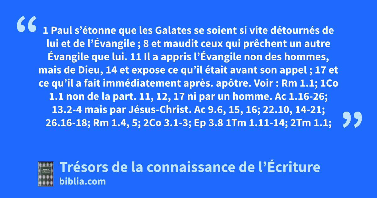 1 Paul s’étonne que les Galates se soient si vite détournés de lui et de l’Évangile ; 8 et maudit ceux qui prêchent un autre Évangile que lui. 11 Il a appris l’Évangile non des hommes, mais de Dieu, 14 et expose ce qu’il était avant son appel ; 17 et ce qu’il a fait immédiatement après.
