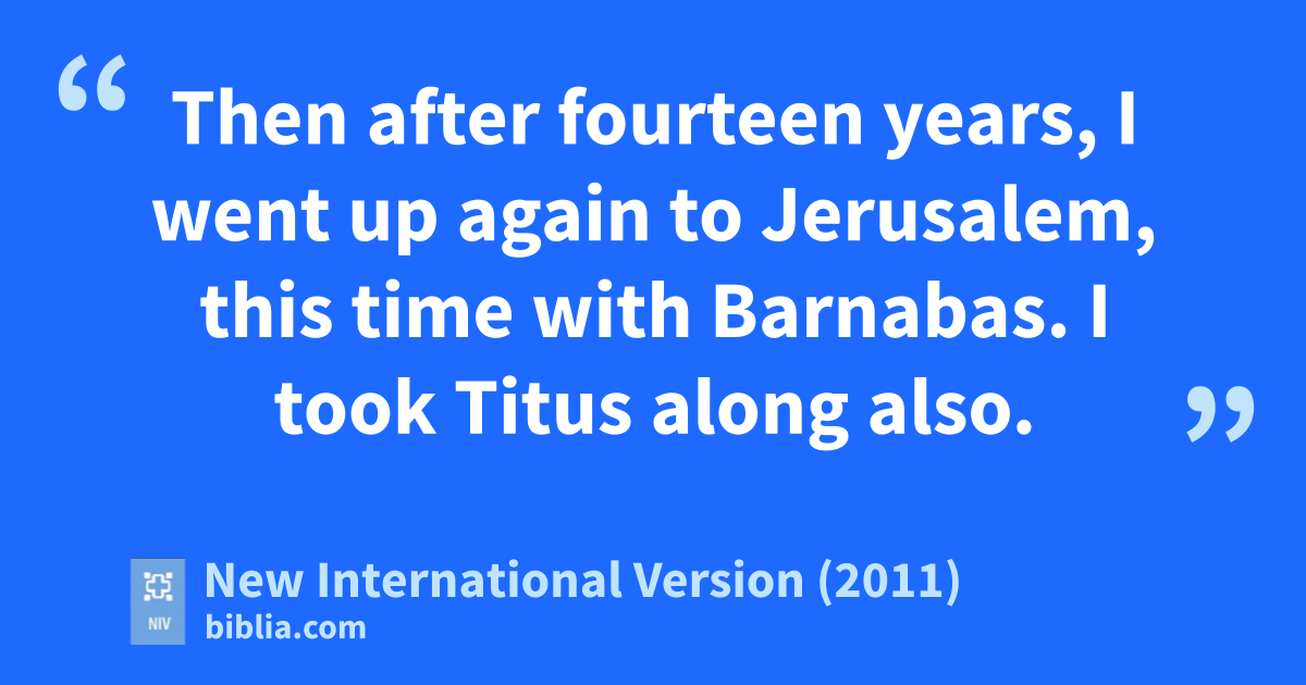 2 Then after fourteen years, I went up again to Jerusalem,v this time with Barnabas.w I took Titusx along also. 2 I went in response to a revelationy and, meeting privately with those esteemed as leaders, I presented to them the gospel that I preach among the Gentiles.z I wanted to be sure I was not running and had not been running my racea in vain. 3 Yet not even Titus,b who was with me, was compelled to be circumcised, even though he was a Greek.c 4 This matter arose because some false believersd had infiltrated our ranks to spy one the freedomf we have in Christ Jesus and to make us slaves. 5 We did not give in to them for a moment, so that the truth of the gospelg might be preserved for you.
