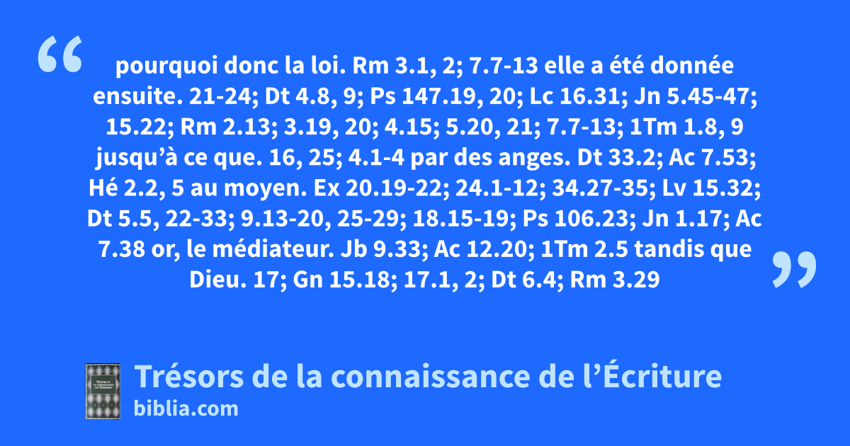pourquoi donc la loi. Rm 3.1, 2; 7.7-13 elle a été donnée ensuite. 21-24; Dt 4.8, 9; Ps 147.19, 20; Lc 16.31; Jn 5.45-47; 15.22; Rm 2.13; 3.19, 20; 4.15; 5.20, 21; 7.7-13; 1Tm 1.8, 9 jusqu’à ce que. 16, 25; 4.1-4 par des anges. Dt 33.2; Ac 7.53; Hé 2.2, 5 au moyen. Ex 20.19-22; 24.1-12; 34.27-35; Lv 15.32; Dt 5.5, 22-33; 9.13-20, 25-29; 18.15-19; Ps 106.23; Jn 1.17; Ac 7.38