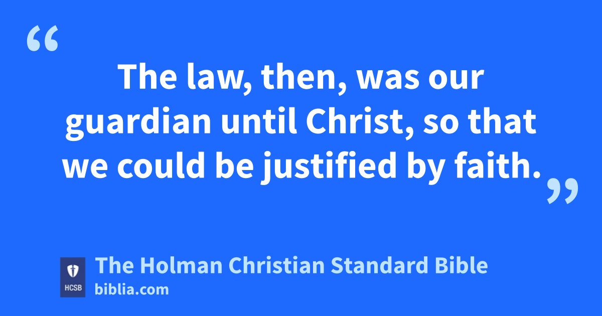 19 Why then was the law given? v It was added because of transgressions until the Seed to whom the promise was made would come. The law was put into effect through angels w by means of a mediator. x 20 Now a mediator is not for just one person, but God is one. y 21 Is the law therefore contrary to God’s promises? Absolutely not! For if a law had been given that was able to give life, then righteousness would certainly be by the law. 22 But the Scripture has imprisoned everything under sin’s power, z a so that the promise by faith in Jesus Christ b might be given to those who believe. c 23 Before this faith d came, we were confined under the law, imprisoned until the coming faith was revealed. e 24 The law, then, was our guardian f until Christ, g so that we could be justified by faith. 25 But since that faith h has come, we are no longer under a guardian, 26 for you are all sons of God through faith in Christ Jesus.