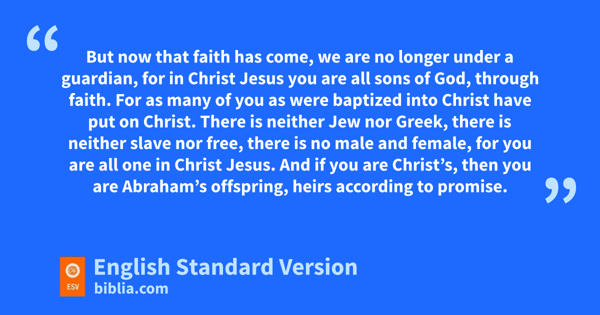 23 Now before faith came, we were held captive under the law, qimprisoned until the coming faith would be revealed. 24 So then, rthe law was our sguardian until Christ came, tin order that we might be justified by faith. 25 But now that faith has come, we are no longer under a guardian, 26 for in Christ Jesus uyou are all sons of God, through faith. 27 For as many of you as vwere baptized winto Christ have xput on Christ. 28 yThere is neither Jew nor Greek, there is neither slave7 nor free, zthere is no male and female, for you are all one in Christ Jesus. 29 And aif you are Christ’s, then you are Abraham’s offspring, bheirs according to promise.