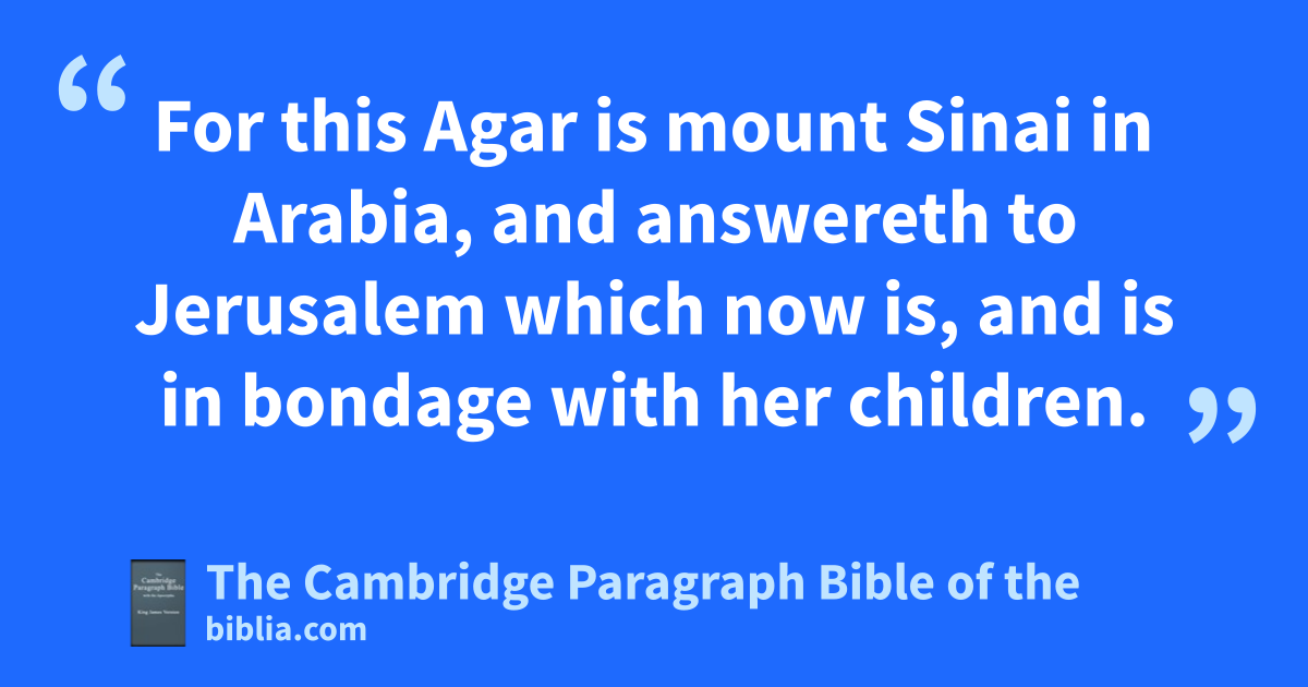 21 Tell me, ye that desire to be under the law, do ye not hear the law? 22 For it is written, that Abraham had two sons, sthe one by a bondmaid, tthe other by a freewoman. 23 But uhe who was of the bondwoman was born after the flesh; twbut he of the freewoman was by promise. 24 Which things are an allegory: for these are the two * covenants; xthe one from the mount * Sinai, which gendereth yto bondage, which is Agar. 25 For this Agar is mount Sinai in zArabia, and * answereth to Jerusalem which now is, and yis in bondage with her children. 26 But aJerusalem which is above is free, which is the mother of us all. 27 For it is written, bRejoice, thou barren that bearest not; break forth and cry, thou that travailest not: for the desolate hath many moe children than she which hath a husband. 28 Now we, cbrethren, as Isaac was, are cthe children of promise. 29 But as then dhe that was born after the flesh persecuted him that was born after the Spirit, eeven so it is now. 30 Nevertheless what saith fthe scripture? gCast out the bondwoman and her son: for the son of the bondwoman shall not be heir with the son of the freewoman. 31 So then, brethren, we are not children of the bondwoman, hbut of the free.