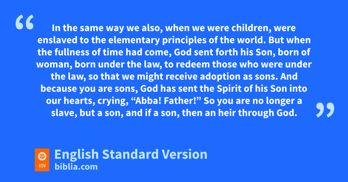 4 I mean that the heir, as long as he is a child, is no different from a slave,1 though he is the owner of everything, 2 but he is under guardians and managers until the date set by his father. 3 In the same way we also, when we were children, cwere enslaved to the elementary principles2 of the world. 4 But dwhen the fullness of time had come, God sent forth his Son, eborn fof woman, born gunder the law, 5 hto redeem those who were under the law, so that we might receive iadoption as sons. 6 And because you are sons, God has sent jthe Spirit of his Son into our hearts, crying, “Abba! Father!” 7 So you are no longer a slave, but a son, and if a son, then kan heir through God.