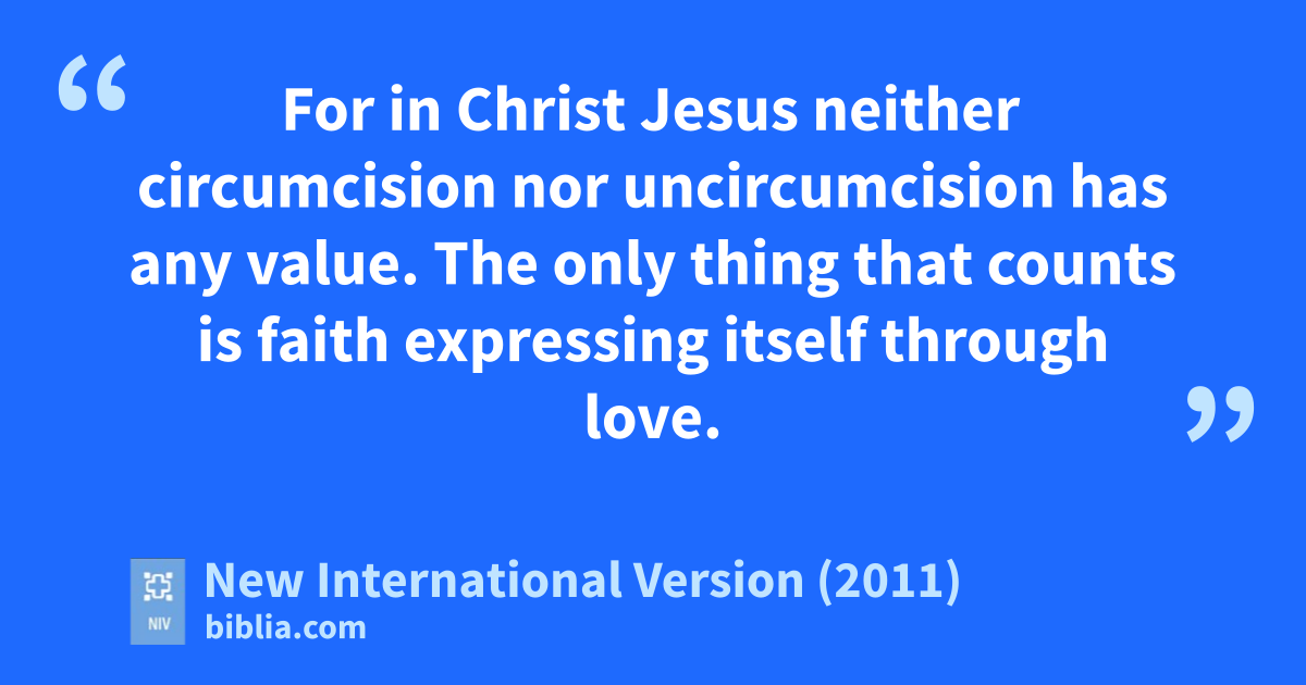 2 Mark my words! I, Paul, tell you that if you let yourselves be circumcised,p Christ will be of no value to you at all. 3 Again I declare to every man who lets himself be circumcised that he is obligated to obey the whole law.q 4 You who are trying to be justified by the lawr have been alienated from Christ; you have fallen away from grace.s 5 For through the Spirit we eagerly await by faith the righteousness for which we hope.t 6 For in Christ Jesusu neither circumcision nor uncircumcision has any value.v The only thing that counts is faith expressing itself through love.w