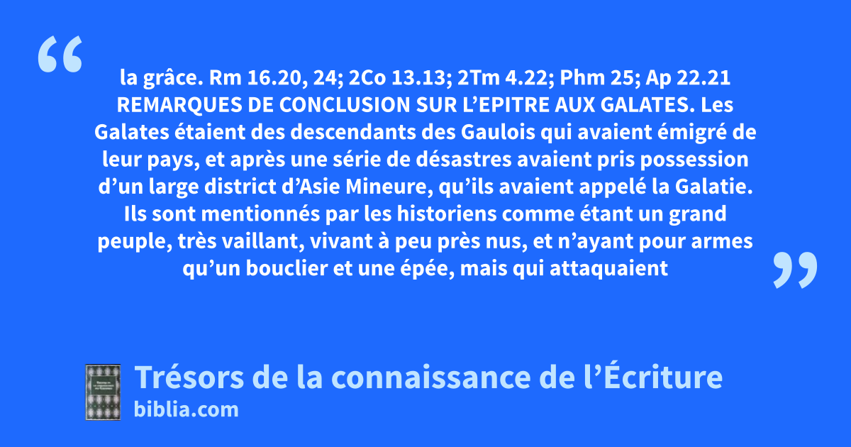 Les Galates étaient des descendants des Gaulois qui avaient émigré de leur pays, et après une série de désastres avaient pris possession d’un large district d’Asie Mineure, qu’ils avaient appelé la Galatie. Ils sont mentionnés par les historiens comme étant un grand peuple, très vaillant, vivant à peu près nus, et n’ayant pour armes qu’un bouclier et une épée, mais qui attaquaient avec une impétuosité qui les rendait irrésistibles. Leur religion, avant leur conversion était largement fondée sur la superstition. Il est dit qu’ils adoraient la mère des dieux, sous le nom d’Adgistis, et qu’ils avaient offert des sacrifices humains avec leurs prisonniers de guerre. Bien qu’ils parlaient le Grec, la langue commune à tous les habitants d’Asie Mineure, ils ont gardé leur langue d’origine, le gaulois, jusqu’au cinquième siècle. Le christianisme semble avoir été implanté dans ces régions par Paul lui-même. 1.6; 4.13 Il a visité les Églises de ces contrées au moins deux fois. Ac 16.6; 18.23 Il est évident que cette épître leur a été adressée très tôt après qu’ils aient reçu l’Évangile, car Paul se plaint de la promptitude de l’apostasie à sa doctrine. 1.6 Comme ici il ne fait pas mention de son second voyage dans le pays, il a été supposé, avec beaucoup de probabilités, que cela fut écrit très tôt après le premier voyage donc vers l’année 52 ou 53. Il apparaît qu’aussitôt que l’apôtre les ait laissés, quelques enseignants se sont introduits dans les Églises, déviant du véritable Évangile pour revenir à observer le cérémonial, et l’effort à la propre justice. C’est dans le but de s’opposer à ce faux évangile que Paul s’adresse aux Galates et qu’après avoir salué les Églises de Galatie et établi sa fonction apostolique contre les attaques des faux docteurs, il leur reproche d’avoir quitté cet Évangile qu’il leur avait prêché, et confirmé par le don du Saint-Esprit. Il prouve que la justification ne vient que de la foi, et non par les actions de la loi, par l’exemple d’Abraham, le témoignage de l’Écriture, la malédiction de la loi, la rédemption de Christ, et l’alliance d’Abraham, que la loi ne peut annuler. Il montre l’utilisation de la loi en liaison avec l’alliance de la grâce, et expose que tous les croyants sont délivrés de la loi, et sont la postérité spirituelle d’Abraham par la foi en Christ. Il illustre cette déduction par le traitement de l’Église Juive par Dieu, qu’il met sous la loi, comme l’image d’un mineur qui est mis sous tutelle. Paul montre la faiblesse et la folie des Galates qui se soumettent à la loi, et qui en acceptant la circoncision sont soumis à toute la loi, au mépris des bienfaits de la grâce. Paul leur donne diverses instructions et exhortations pour leur conduite chrétienne, et en particulier en ce qui concerne l’utilisation de leur liberté. En conclusion il y a un bref sommaire des thèmes qui ont été discutés et un appel à la grâce de Christ.