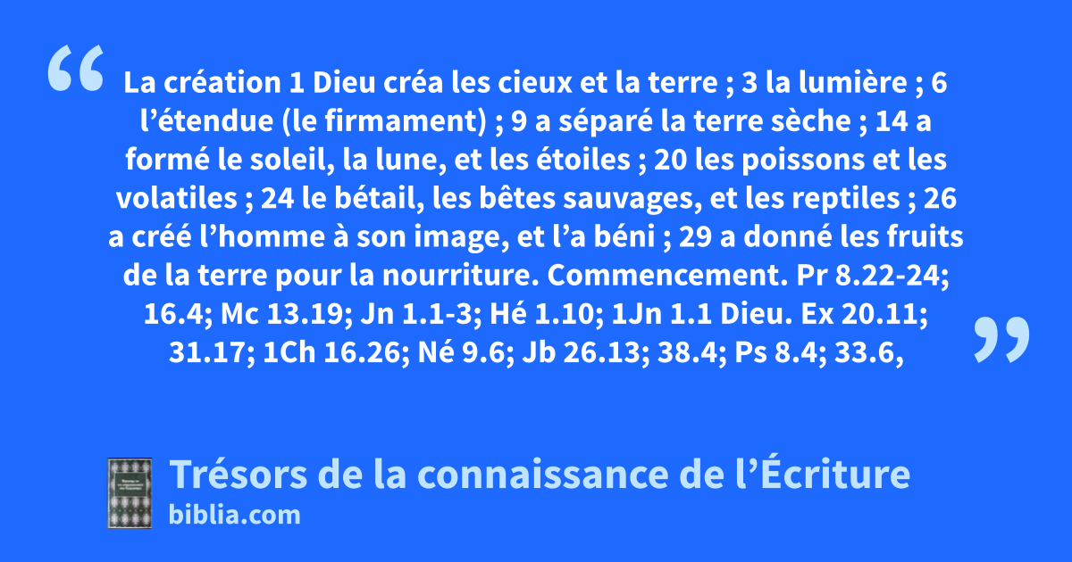 Commencement. Pr 8.22-24; 16.4; Mc 13.19; Jn 1.1-3; Hé 1.10; 1Jn 1.1 Dieu. Ex 20.11; 31.17; 1Ch 16.26; Né 9.6; Jb 26.13; 38.4; Ps 8.4; 33.6, 9; Ps 89.12, 13; 96.5; 102.26; 104.24, 30; 115.15; 121.2; 124.8; 134.3; Ps 136.5; 146.6; 148.4, 5; Pr 3.19; 8.22-30; Ec 12.3; Es 37.16; 40.26; Es 40.28; 42.5; 44.24; 45.18; 51.13, 16; 65.17; Jr 10.12; 32.17; Jr 51.15; Za 12.1; Mt 11.25; Ac 4.24; 14.15; 17.24; Rm 1.19, 20; Rm 11.36; 1Co 8.6; Ep 3.9; Col 1.16, 17; Hé 1.2; 3.4; 11.3; 2P 3.5; Ap 3.14; 4.11; 10.6; 14.7; 21.6; 22.13