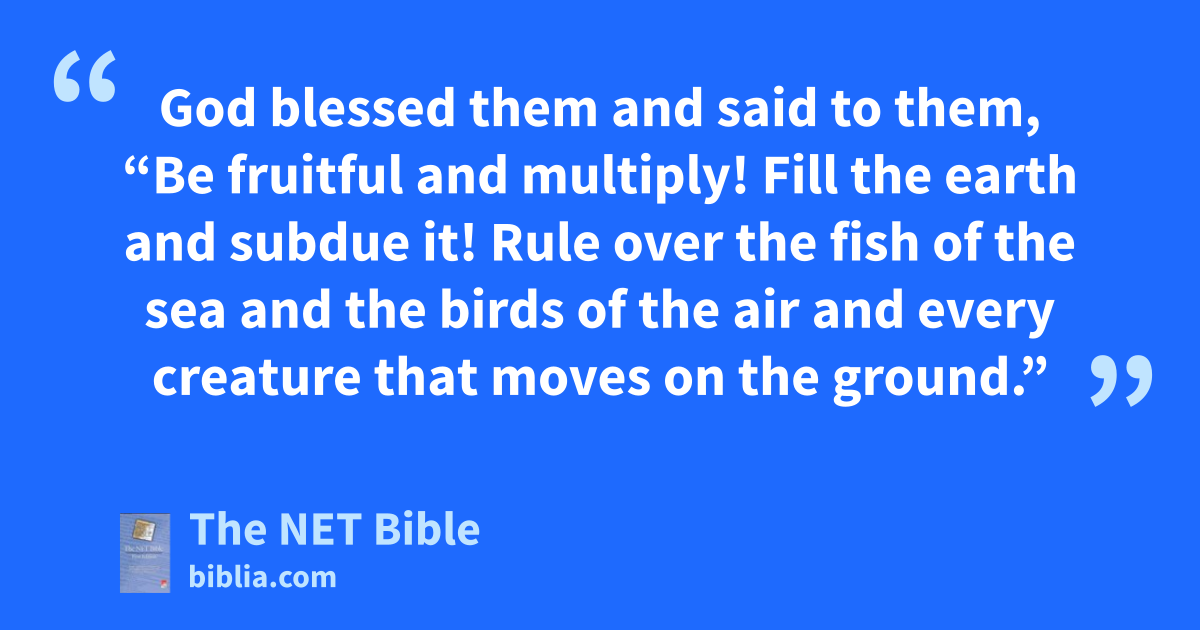 1:28 God blessed56 them and said57 to them, “Be fruitful and multiply! Fill the earth and subdue it!58 Rule over the fish of the sea and the birds of the air and every creature that moves on the ground.”59 1:29 Then God said, “I now60 give you every seed-bearing plant on the face of the entire earth and every tree that has fruit with seed in it. They will be yours for food.61 1:30 And to all the animals of the earth, and to every bird of the air, and to all the creatures that move on the ground—everything that has the breath of life in it—I give62 every green plant for food.” It was so.