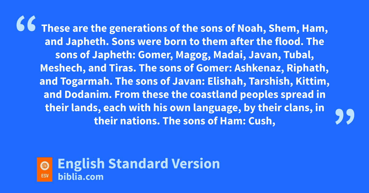 2 kThe sons of Japheth: Gomer, Magog, Madai, Javan, Tubal, Meshech, and Tiras. 3 The sons of Gomer: Ashkenaz, Riphath, and Togarmah. 4 The sons of Javan: Elishah, lTarshish, mKittim, and Dodanim. 5 From these nthe coastland peoples spread in their lands, each with his own language, by their clans, in their nations.