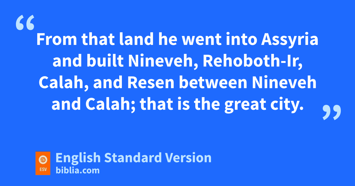 6 oThe sons of Ham: Cush, Egypt, Put, and Canaan. 7 The sons of Cush: Seba, Havilah, Sabtah, Raamah, and Sabteca. The sons of Raamah: Sheba and Dedan. 8 Cush fathered Nimrod; he was the first on earth to be a mighty man.1 9 He was a mighty hunter before the Lord. Therefore it is said, “Like Nimrod a mighty hunter before the Lord.” 10 The beginning of his kingdom was pBabel, Erech, Accad, and Calneh, in qthe land of Shinar. 11 From that land he went into Assyria and built Nineveh, Rehoboth-Ir, Calah, and 12 Resen between Nineveh and Calah; that is the great city. 13 rEgypt fathered Ludim, Anamim, Lehabim, Naphtuhim, 14 Pathrusim, Casluhim (from whom2 the Philistines came), and sCaphtorim.