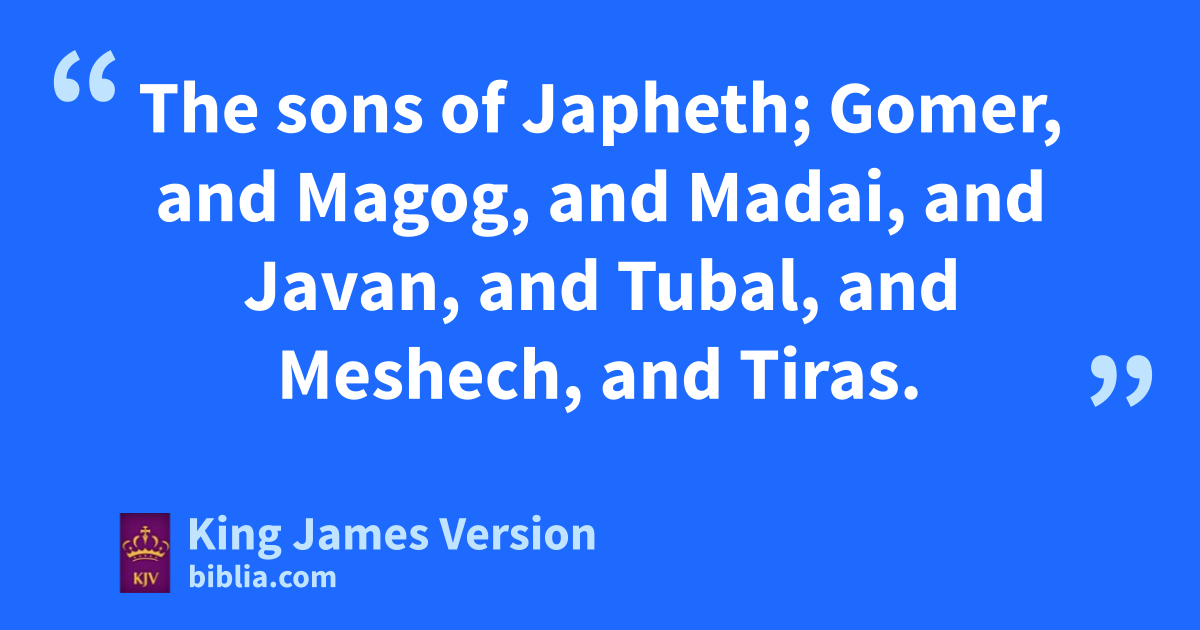 10 Now these are the generations of the sons of Noah, Shem, Ham, and Japheth: and unto them were sons born after the flood. 2 aThe sons of Japheth; bGomer, and cMagog, and Madai, and dJavan, and cTubal, and cMeshech, and Tiras. 3 And the sons of Gomer; eAshkenaz, and Riphath, and bTogarmah. 4 And the sons of Javan; Elishah, and fTarshish, gKittim, and ||Dodanim. 5 By these were gthe isles of the Gentiles divided in their lands; every one after his tongue, after their families, in their nations.