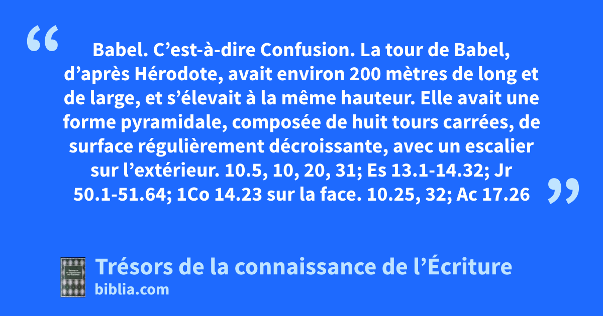 Babel. C’est-à-dire Confusion. La tour de Babel, d’après Hérodote, avait environ 200 mètres de long et de large, et s’élevait à la même hauteur. Elle avait une forme pyramidale, composée de huit tours carrées, de surface régulièrement décroissante, avec un escalier sur l’extérieur. 10.5, 10, 20, 31; Es 13.1-14.32; Jr 50.1-51.64; 1Co 14.23 sur la face. 10.25, 32; Ac 17.26