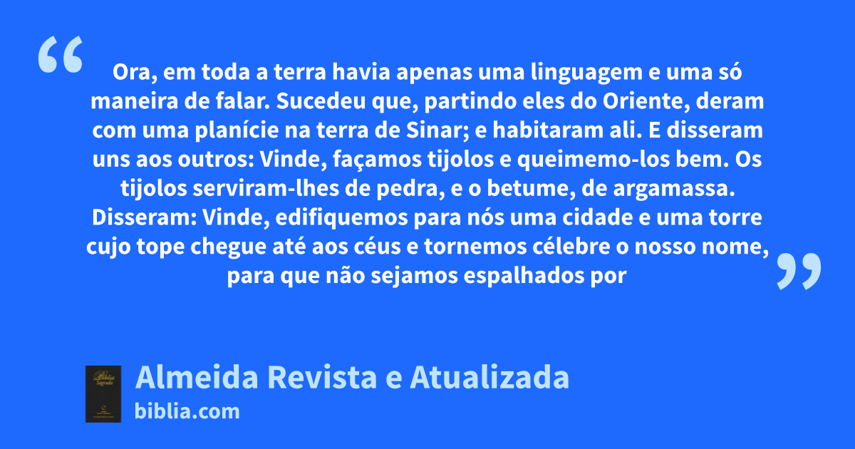 11 1 Ora, em toda a terra havia apenas uma linguagem e uma só maneira de falar. 2 Sucedeu que, partindo eles do Oriente, deram com uma planície na terra de Sinar; e habitaram ali. 3 E disseram uns aos outros: Vinde, façamos tijolos e queimemo-los bem. Os tijolos serviram-lhes de pedra, e o betume, de argamassa. 4 Disseram: Vinde, edifiquemos para nós uma cidade e uma torre cujo tope chegue até aos céus e tornemos célebre o nosso nome, para que não sejamos espalhados por toda a terra. 5 Então, desceu o Senhor para ver a cidade e a torre, que os filhos dos homens edificavam; 6 e o Senhor disse: Eis que o povo é um, e todos têm a mesma linguagem. Isto é apenas o começo; agora não haverá restrição para tudo que intentam fazer. 7 Vinde, desçamos e confundamos ali a sua linguagem, para que um não entenda a linguagem de outro. 8 Destarte, o Senhor os dispersou dali pela superfície da terra; e cessaram de edificar a cidade. 9 Chamou-se-lhe, por isso, o nome de Babel, porque ali confundiu o Senhor a linguagem de toda a terra e dali o Senhor os dispersou por toda a superfície dela.