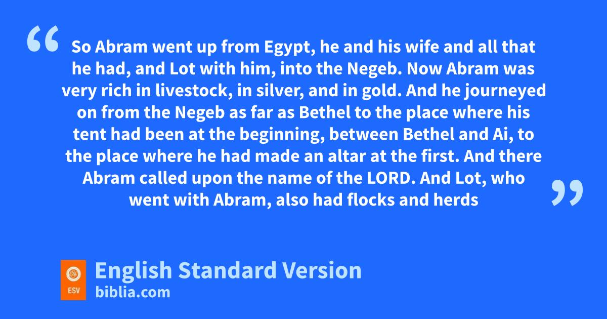 2 bNow Abram was very rich in livestock, in silver, and in gold. 3 And he journeyed on from the Negeb as far as Bethel to the place where his tent had been at the beginning, between Bethel and Ai, 4 to cthe place where he had made an altar at the first. And there Abram called upon the name of the Lord. 5 And Lot, who went with Abram, also had flocks and herds and tents, 6 so that dthe land could not support both of them dwelling together; for their possessions were so great that they could not dwell together, 7 eand there was strife between the herdsmen of Abram’s livestock and the herdsmen of Lot’s livestock. At that time fthe Canaanites and the Perizzites were dwelling in the land.