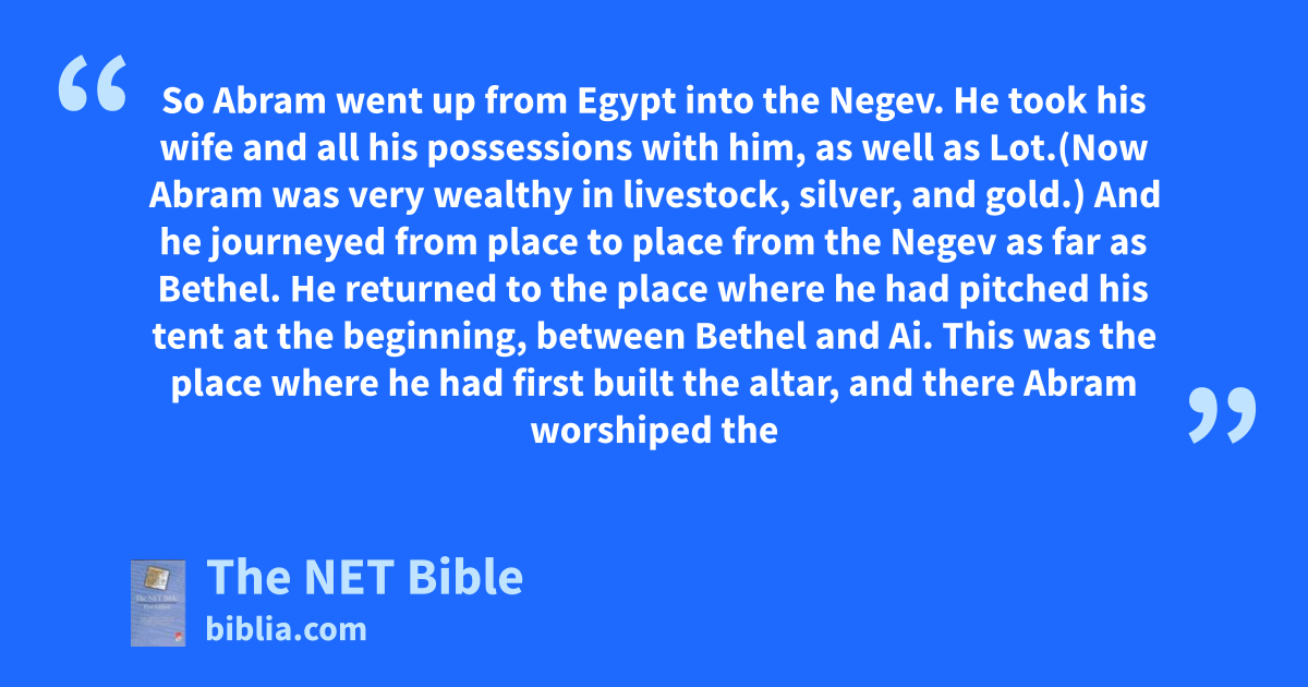 13:3 And he journeyed from place to place5 from the Negev as far as Bethel.6 He returned7 to the place where he had pitched his tent8 at the beginning, between Bethel and Ai. 13:4 This was the place where he had first built the altar,9 and there Abram worshiped the Lord.10