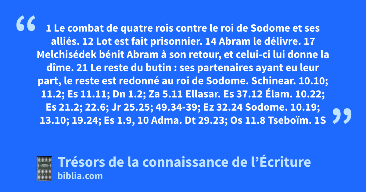 1 Le combat de quatre rois contre le roi de Sodome et ses alliés. 12 Lot est fait prisonnier. 14 Abram le délivre. 17 Melchisédek bénit Abram à son retour, et celui-ci lui donne la dîme. 21 Le reste du butin : ses partenaires ayant eu leur part, le reste est redonné au roi de Sodome.