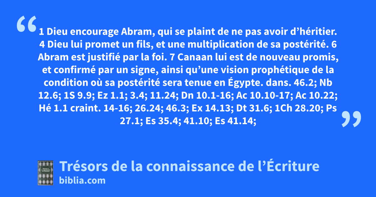 1 Dieu encourage Abram, qui se plaint de ne pas avoir d’héritier. 4 Dieu lui promet un fils, et une multiplication de sa postérité. 6 Abram est justifié par la foi. 7 Canaan lui est de nouveau promis, et confirmé par un signe, ainsi qu’une vision prophétique de la condition où sa postérité sera tenue en Égypte.