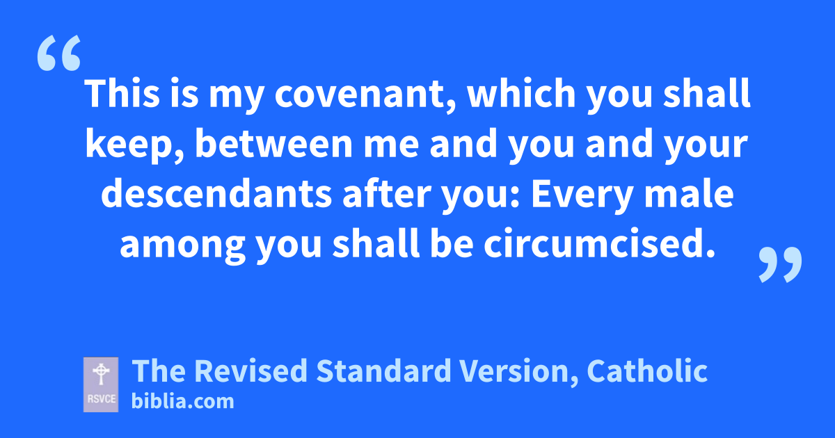9 And God said to Abraham, “As for you, you shall keep my covenant, you and your descendants after you throughout their generations. 10 This is my covenant, which you shall keep, between me and you and your descendants after you: Every male among you shall be circumcised. 11 You shall be circumcised in the flesh of your foreskins, and it shall be a sign of the covenant between me and you. 12 He that is eight days old among you shall be circumcised; every male throughout your generations, whether born in your house, or bought with your money from any foreigner who is not of your offspring, 13 both he that is born in your house and he that is bought with your money, shall be circumcised. So shall my covenant be in your flesh an everlasting covenant. 14 Any uncircumcised male who is not circumcised in the flesh of his foreskin shall be cut off from his people; he has broken my covenant.”