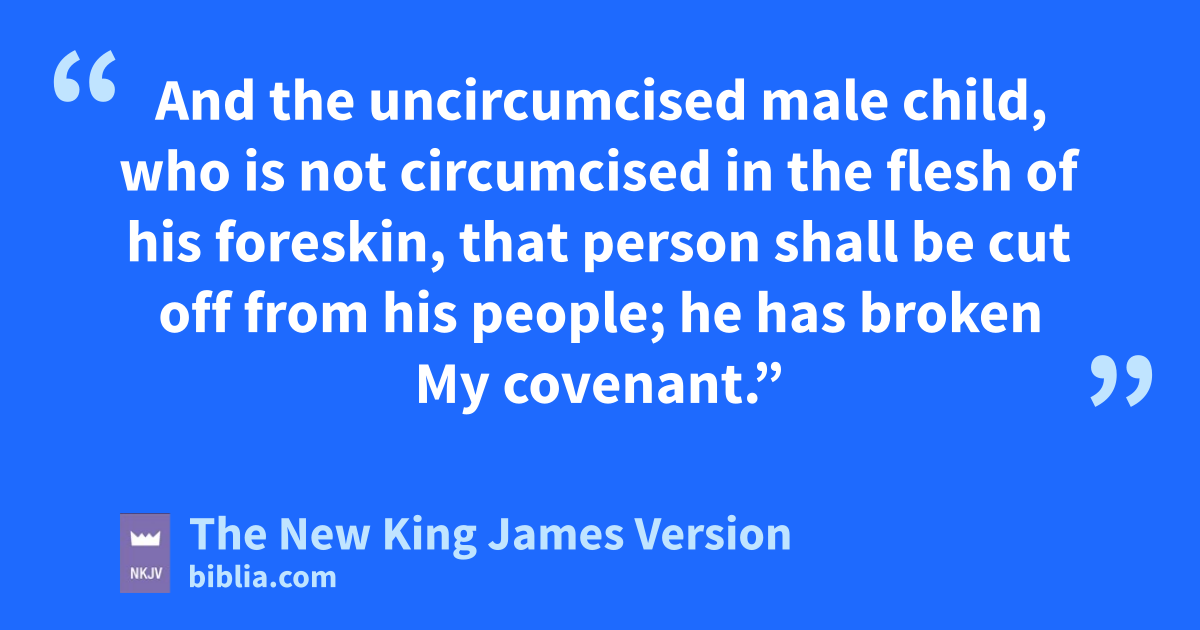 9 And God said to Abraham: “As for you, ryou shall keep My covenant, you and your descendants after you throughout their generations. 10 This is My covenant which you shall keep, between Me and you and your descendants after you: sEvery male child among you shall be circumcised; 11 and you shall be circumcised in the flesh of your foreskins, and it shall be ta sign of the covenant between Me and you. 12 He who is eight days old among you ushall be circumcised, every male child in your generations, he who is born in your house or bought with money from any foreigner who is not your descendant. 13 He who is born in your house and he who is bought with your money must be circumcised, and My covenant shall be in your flesh for an everlasting covenant. 14 And the uncircumcised male child, who is not circumcised in the flesh of his foreskin, that person vshall be cut off from his people; he has broken My covenant.”
