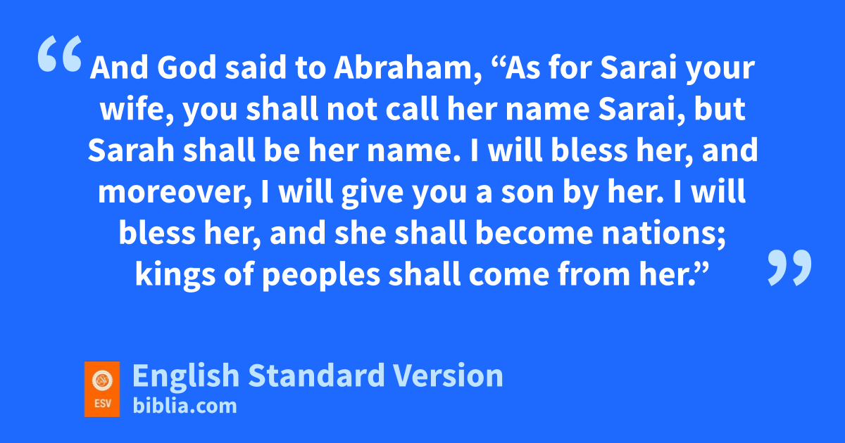 15 And God said to Abraham, “As for Sarai your wife, you shall not call her name Sarai, but Sarah4 shall be her name. 16 I will bless her, and moreover, I will cgive5 you a son by her. I will bless her, and dshe shall become nations; kings of peoples shall come from her.” 17 Then Abraham efell on his face fand laughed and said to himself, “Shall a child be born to a man who is a hundred years old? Shall Sarah, who is ninety years old, bear a child?” 18 And Abraham said to God, “Oh that Ishmael might live before you!” 19 God said, “No, but gSarah your wife shall bear you a son, and you shall call his name hIsaac.6 I will establish my covenant with him as an everlasting covenant for his offspring after him. 20 As for Ishmael, I have heard you; behold, I have blessed him and will make him fruitful and imultiply him greatly. He jshall father twelve princes, and kI will make him into a great nation. 21 But lI will establish my covenant with Isaac, mwhom Sarah shall bear to you at this time next year.”