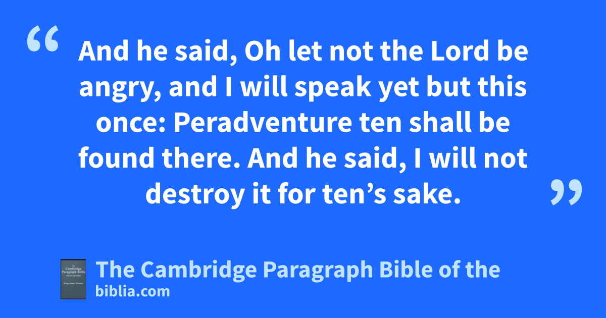 23 And Abraham cdrew near, and said, dWilt thou also destroy the righteous with the wicked? 24 Peradventure there be fifty righteous within the city: wilt thou also destroy and not spare the place for the fifty righteous that are therein? 25 That be far from thee to do after this manner, to slay the righteous with the wicked: and ethat the righteous should be as the wicked, that be far from thee: fShall not the Judge of all the earth do right? 26 And the Lord said, gIf I find in Sodom fifty righteous within the city, then I will spare all the place for their sakes. 27 And Abraham answered and said, hBehold now, I have taken upon me to speak unto the Lord, which am but idust and ashes: 28 Peradventure there shall lack five of the fifty righteous: wilt thou destroy all the city for lack of five? And he said, If I find there forty and five, I will not destroy it. 29 And he spake unto him yet again, and said, Peradventure there shall be forty found there. And he said, I will not do it for forty’s sake. 30 And he said unto him, Oh let not the Lord be angry, and I will speak: Peradventure there shall thirty be found there. And he said, I will not do it, if I find thirty there. 31 And he said, Behold now, I have taken upon me to speak unto the Lord: Peradventure there shall be twenty found there. And he said, I will not destroy it for twenty’s sake. 32 And he said, kOh let not the Lord be angry, and I will speak yet but this once: Peradventure ten shall be found there. And he said, I will not destroy it for ten’s sake. 33 And the Lord went his way, as soon as he had left communing with Abraham: and Abraham returned unto his place.