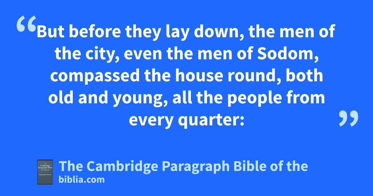 XIX. And there acame two angels to Sodom at even; and Lot sat in the gate of Sodom: and bLot seeing them rose up to meet them; and he bowed himself with his face toward the ground; 2 and he said, Behold now, my lords, cturn in, I pray you, into your servant’s house, and tarry all night, and dwash your feet, and ye shall rise up early, and go on your ways. And they said, eNay; but we will abide in the street all night. 3 And he pressed upon them greatly; and they turned in unto him, and entered into his house; and he made them a feast, and did bake unleavened bread, and they did eat. 4 But before they lay down, the men of the city, even the men of Sodom, compassed the house round, both old and young, all the people from every quarter: 5 fand they called unto Lot, and said unto him, Where are the men which came in to thee this night? gbring them out unto us, that we hmay know them. 6 And iLot went out at the door unto them, and shut the door after him, 7 and said, I pray you, brethren, do not so wickedly. 8 kBehold now, I have two daughters which have not known man; let me, I pray you, bring them out unto you, and do ye to them as is good in your eyes: only unto these men do nothing; lfor therefore came they under the shadow of my roof. 9 And they said, Stand back. And they said again, This one fellow mcame in to sojourn, nand he will needs be a judge: now will we deal worse with thee, than with them. And they pressed sore upon the man, even Lot, and came near to break the door. 10 But the men put forth their hand, and pulled Lot into the house to them, and shut to the door. 11 And they smote the men that were at the door of the house with oblindness, both small and great; so that they wearied themselves to find the door. 12 And the men said unto Lot, Hast thou here any besides? son in law, and thy sons, and thy daughters, and whatsoever thou hast in the city, pbring them out of this place: 13 for we will destroy this place, because the cry of them is waxen great before the face of the Lord; and the Lord hath sent us to destroy it. 14 And Lot went out, and spake unto his qsons in law, which married his daughters, and said, rUp, get ye out of this place; for the Lord will destroy this city. But he seemed as one that mocked unto his sons in law. 15 And when the morning arose, then the angels hastened Lot, saying, Arise, take thy wife, and thy two daughters, which * are here; lest thou be consumed in the * iniquity of the city. 16 And while he lingered, the men laid hold upon his hand, and upon the hand of his wife, and upon the hand of his two daughters; sthe Lord being merciful unto him: and they brought him forth, and set him without the city. 17 And it came to pass, when they had brought them forth abroad, that he said, Escape for thy life; tlook not behind thee, neither stay thou in all the plain; escape to the mountain, lest thou be consumed. 18 And Lot said unto them, Oh, unot so, my Lord: 19 behold now, thy servant hath found grace in thy sight, and thou hast magnified thy mercy, which thou hast shewed unto me in saving my life; and I cannot escape to the mountain, lest some evil take me, and I die: 20 behold now, this city is near to flee unto, and it is a little one: Oh, let me escape thither, (is it not a little one?) and my soul shall live. 21 And he said unto him, See, wI have accepted * thee concerning this thing, that I will not overthrow this city, for the which thou hast spoken. 22 Haste thee, escape thither; for xI cannot do any thing till thou be come thither. Therefore ythe name of the city was called * Zoar. 23 The sun was * risen upon the earth when Lot entered into Zoar. 24 Then zthe Lord rained upon Sodom and upon Gomorrah brimstone and fire from the Lord out of heaven; 25 and he overthrew those cities, and all the plain, and all the inhabitants of the cities, and that which grew upon the ground. 26 But his wife looked back from behind him, and she became aa pillar of salt. 27 And Abraham gat up early in the morning to the place where bhe stood before the Lord: 28 and he looked toward Sodom and Gomorrah, and toward all the land of the plain, and beheld, and lo, cthe smoke of the country went up as the smoke of a furnace. 29 And it came to pass, when God destroyed the cities of the plain, that God dremembered Abraham, and sent Lot out of the midst of the overthrow, when he overthrew the cities in the which Lot dwelt.