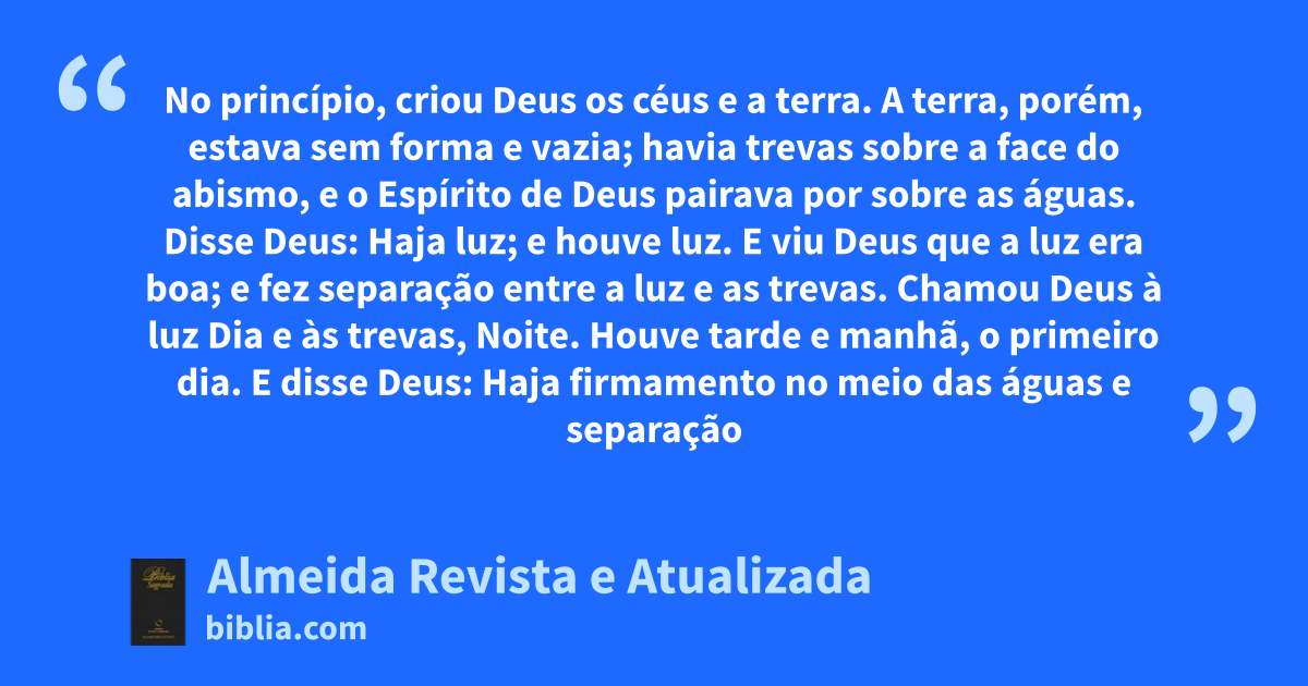 1 1 No princípio, criou Deus os céus e a terra. 2 A terra, porém, estava sem forma e vazia; havia trevas sobre a face do abismo, e o Espírito de Deus pairava por sobre as águas.
