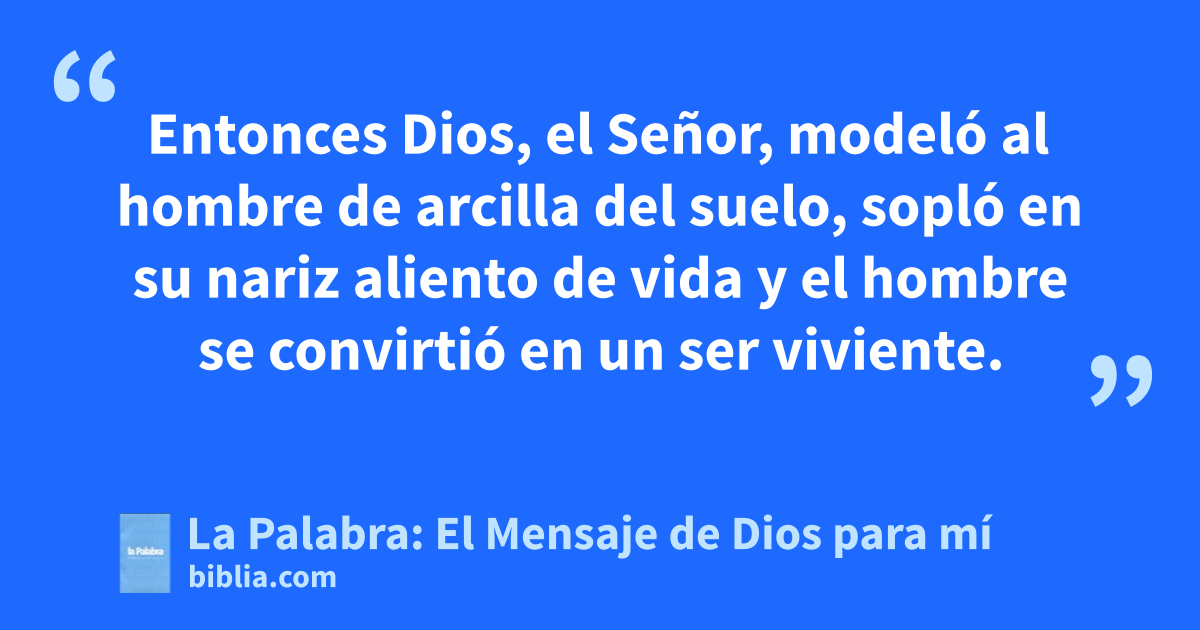 Cuando Dios, el Señor, hizo la tierra y el cielo 5 no había aún arbustos en la tierra ni la hierba había brotado, porque Dios, el Señor, todavía no había hecho llover sobre la tierra ni existía nadie que cultivase el suelo; 6 sin embargo, de la propia tierra brotaba un manantial que regaba toda la superficie del suelo. 7 Entonces Dios, el Señor, modeló al hombre de arcilla del suelo, sopló en su nariz aliento de vida y el hombre se convirtió en un ser viviente.