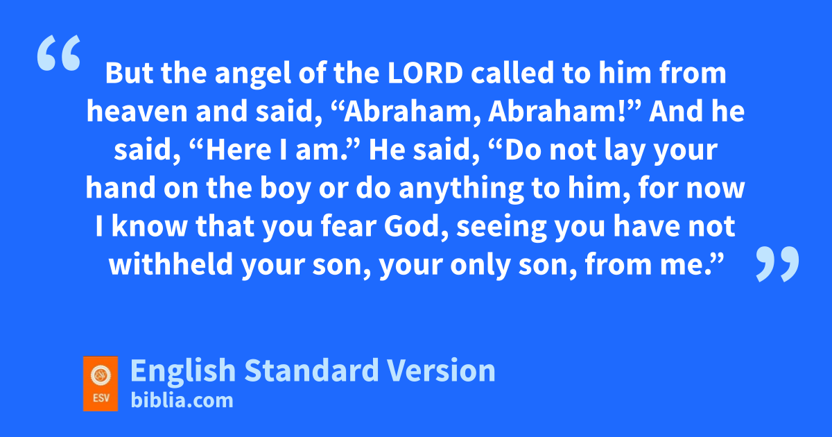 9 When they came to the place of which God had told him, Abraham built the altar there and laid the wood in order and bound Isaac his son and olaid him on the altar, on top of the wood. 10 Then Abraham reached out his hand and took the knife to slaughter his son. 11 But the angel of the Lord called to him from heaven and said, “Abraham, Abraham!” And he said, “Here I am.” 12 He said, p“Do not lay your hand on the boy or do anything to him, for qnow I know that you fear God, seeing you have not withheld your son, your only son, from me.” 13 And Abraham lifted up his eyes and looked, and behold, behind him was a ram, caught in a thicket by his horns. And Abraham went and took the ram and offered it up as a burnt offering instead of his son. 14 So Abraham called the name of that place, r“The Lord will provide”;2 as it is said to this day, “On the mount of the Lord it shall be provided.”3