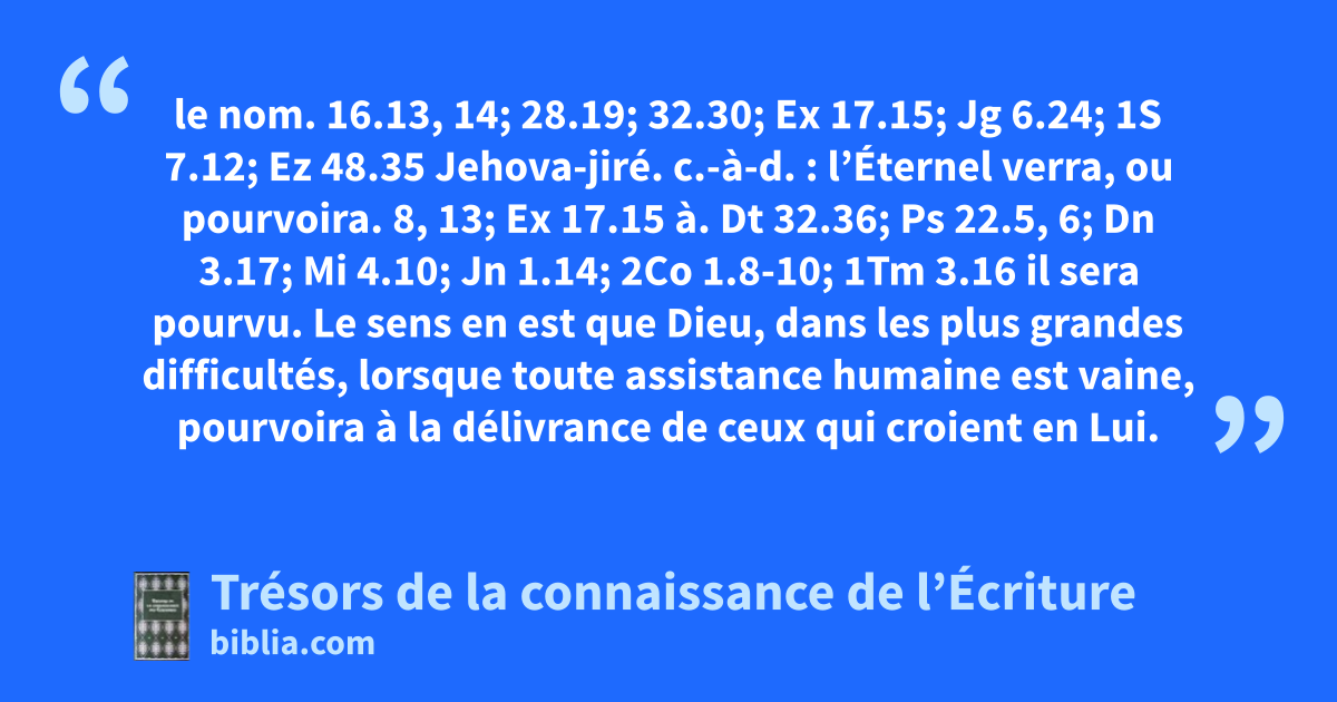 le nom. 16.13, 14; 28.19; 32.30; Ex 17.15; Jg 6.24; 1S 7.12; Ez 48.35 Jehova-jiré. c.-à-d. : l’Éternel verra, ou pourvoira. 8, 13; Ex 17.15 à. Dt 32.36; Ps 22.5, 6; Dn 3.17; Mi 4.10; Jn 1.14; 2Co 1.8-10; 1Tm 3.16 il sera pourvu. Le sens en est que Dieu, dans les plus grandes difficultés, lorsque toute assistance humaine est vaine, pourvoira à la délivrance de ceux qui croient en Lui.