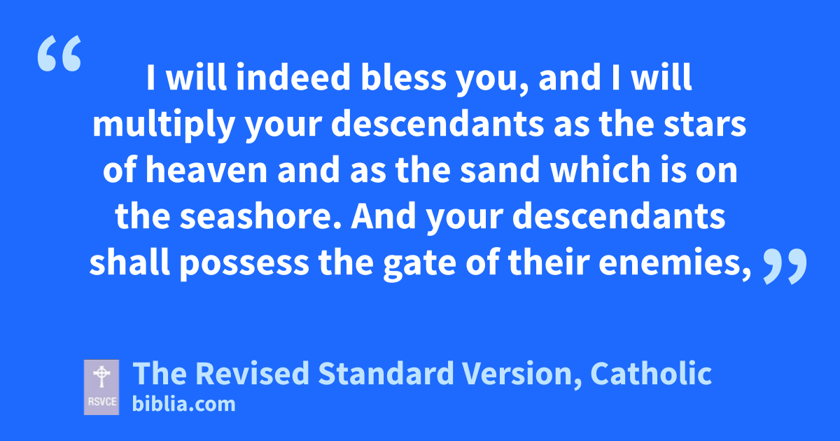 15 And the angel of the Lord called to Abraham a second time from heaven, 16 and said, “By myself I have sworn, says the Lord, because you have done this, and have not withheld your son, your only son, 17 I will indeed bless you, and I will multiply your descendants as the stars of heaven and as the sand which is on the seashore. And your descendants shall possess the gate of their enemies, 18 and by your descendants shall all the nations of the earth bless themselves, because you have obeyed my voice.” 19 So Abraham returned to his young men, and they arose and went together to Beer-sheba; and Abraham dwelt at Beer-sheba.